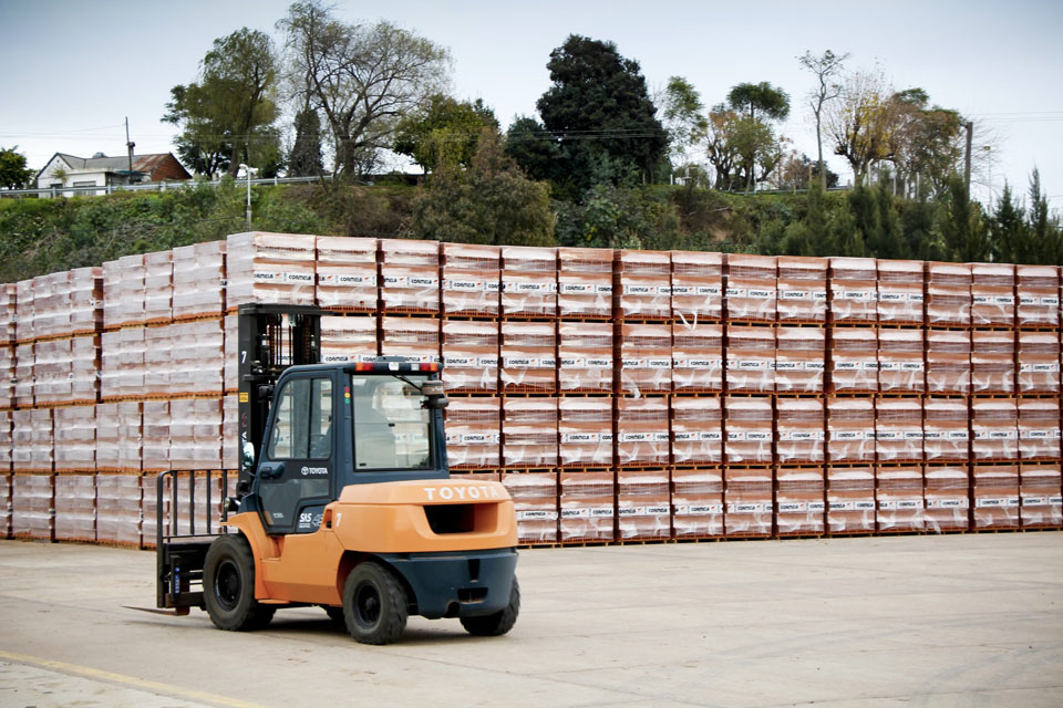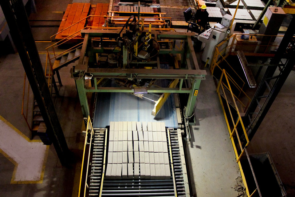 Los ladrillos son descargados de las vagonetas del horno túnel por una DESAPILADORA que descarga paquetes completos (1 m3), disponiéndolos sobre pallets de madera para luego ser envueltos en nylon extensible mediante una ENVOLVEDORA.