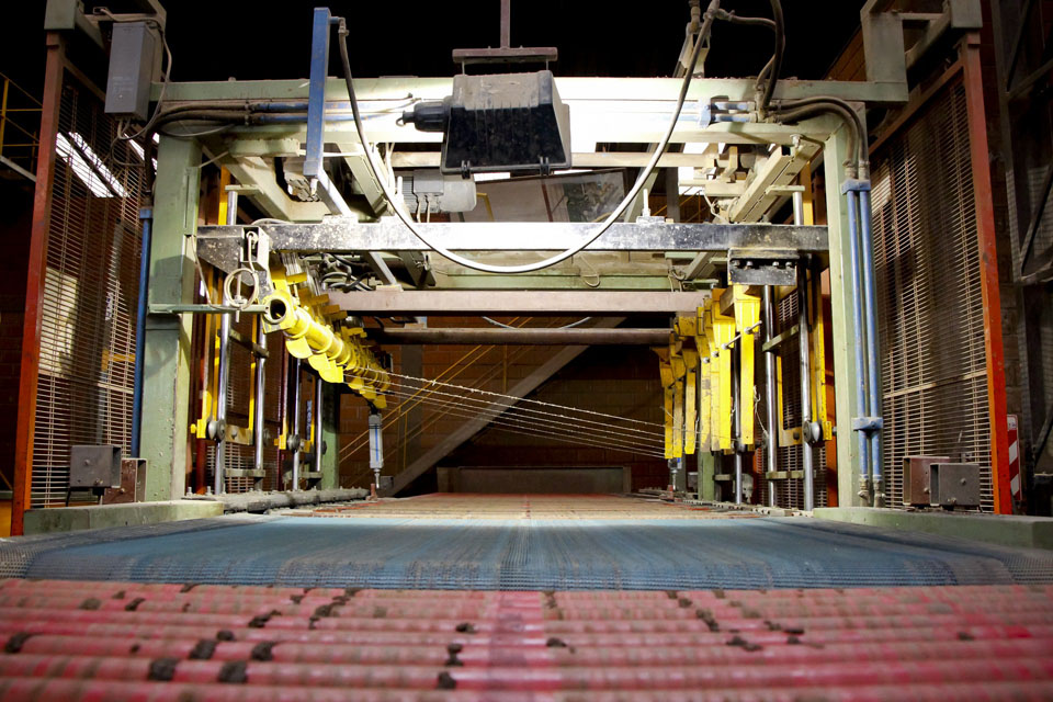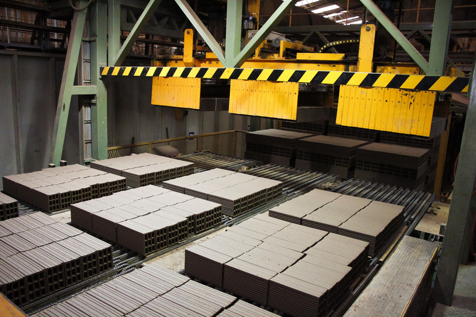 Los ladrillos secos son cargados sobre las vagonetas del horno túnel mediante una APILADORA computarizada que comanda un conjunto de pinzas que apilan y traban paquetes de 1 m3 cada uno. Esta traba se hace teniendo en cuenta la estabilidad de la carga y el pasaje de los gases de combustión dentro del horno túnel.