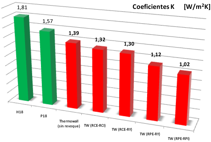 En el gráfico se muestran los valores de los coeficientes de transmitancia térmica K de producto Thermowall (TW) comparado con otros productos y con diferentes tipos de revoques.